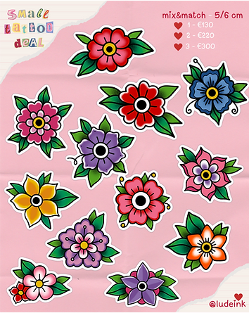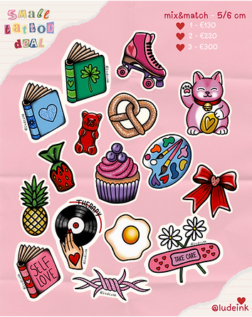 Small Tattoo Deal This is valid for the designs available here, if you want a new art in this size, please select the custom tattoo option 💖 Size: between 5 and 6 cm Available in Colour or black+white Not possible to share deal with a friends Price is valid for arms and legs, additional cost may apply for some placements. 1 = €130 2 = €220 3 = €300